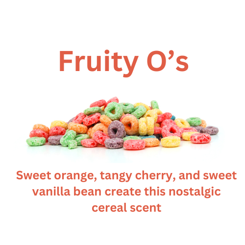 Bright, playful, and nostalgic â Fruity Oâs captures the aroma of your favorite fruity cereal. Sweet orange, tangy lemon, and zesty lime swirl with creamy vanilla and a cozy hint of sandalwood for a scent that sparks pure joy.
